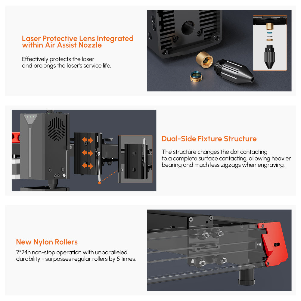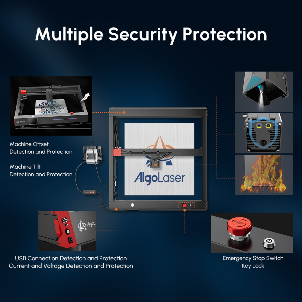 Safety Features: Active Power-Out detection and protection, Laser Over-Exposure Time Limit, USB disconnect shutdown, Emergency stop button, Gyroscope detection, Motherboard over-temperature protection.