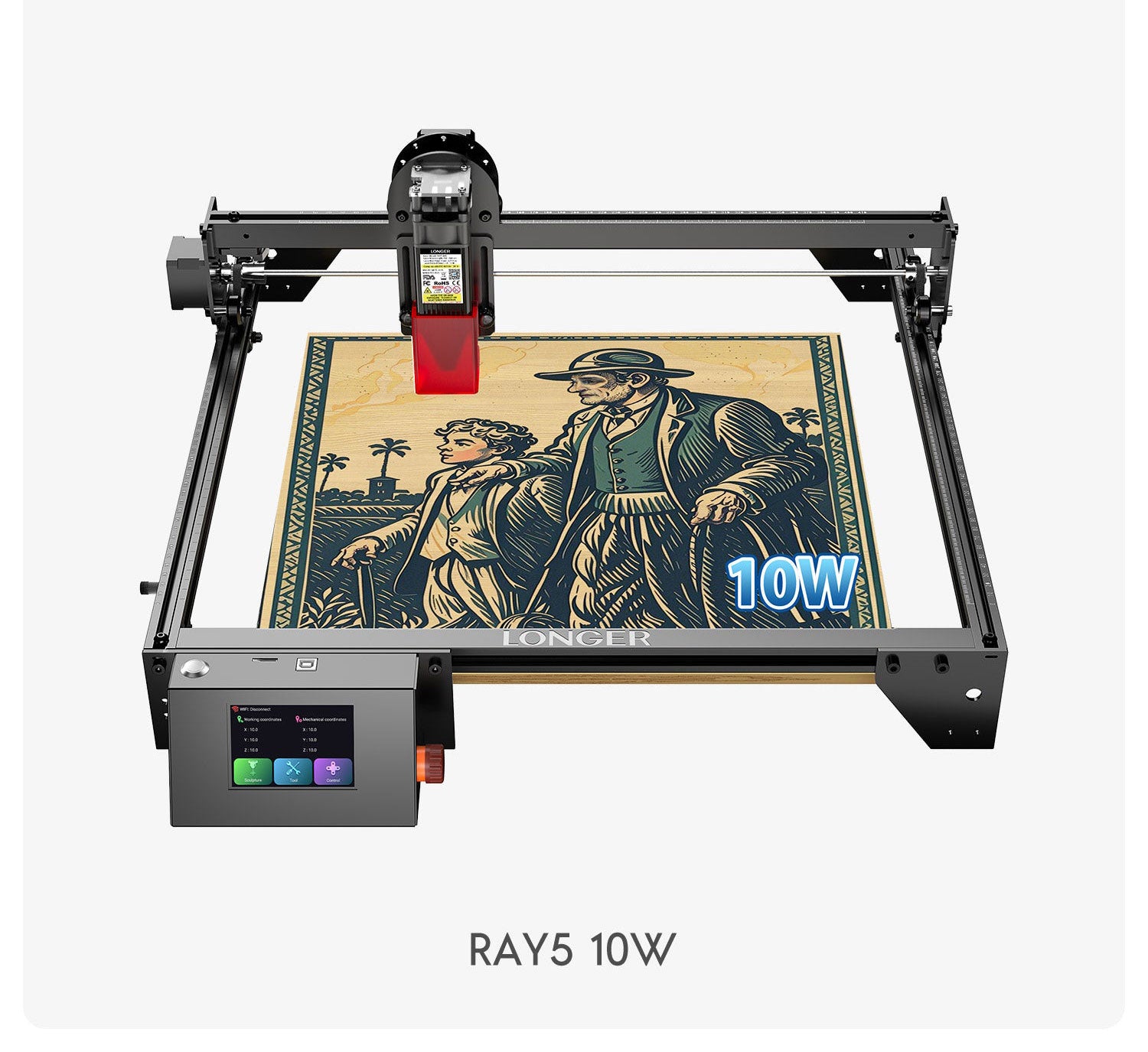 RAY5 10W features a 400x400mm (15.75"x15.75") work area, providing ample space to unleash your creativity