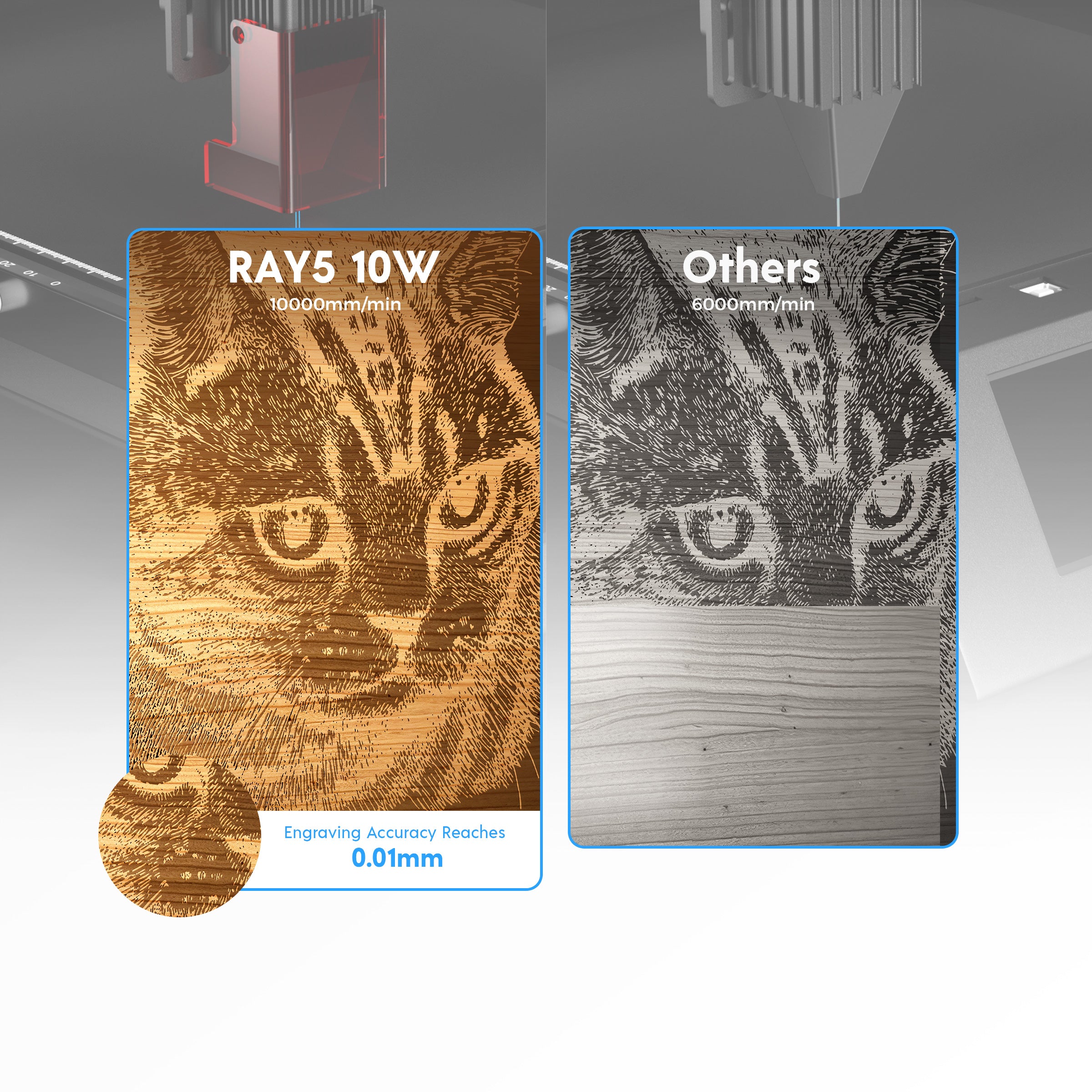 The RAY5 10W laser engraver boasts an industry-leading engraving speed of up to 10,000mm/min. This breakneck pace, combined with an accuracy of 0.01mm, empowers you to engrave intricate details with unprecedented speed and precision. Experience a new level of efficiency in bringing your creative visions to life.