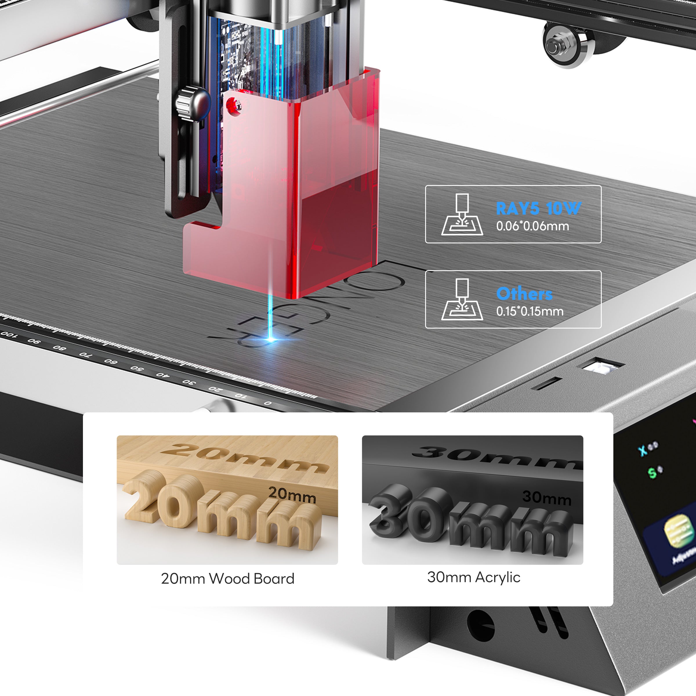 Ray5 10W laser engraver has a strong 12W output power and adopts the latest laser FAC compressed technology, the laser spot size is 0.06*0.06mm, which makes engraving or cutting more strong and precise. The engraving speed can reach up to 10000 mm/min