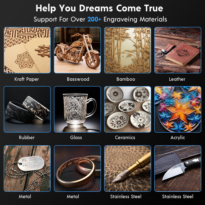 - Quad-Core Diode Laser, 22-24W Output, Capable of cutting through materials like 25mm pinewood, 35mm acrylic and 0.05mm stainless steel