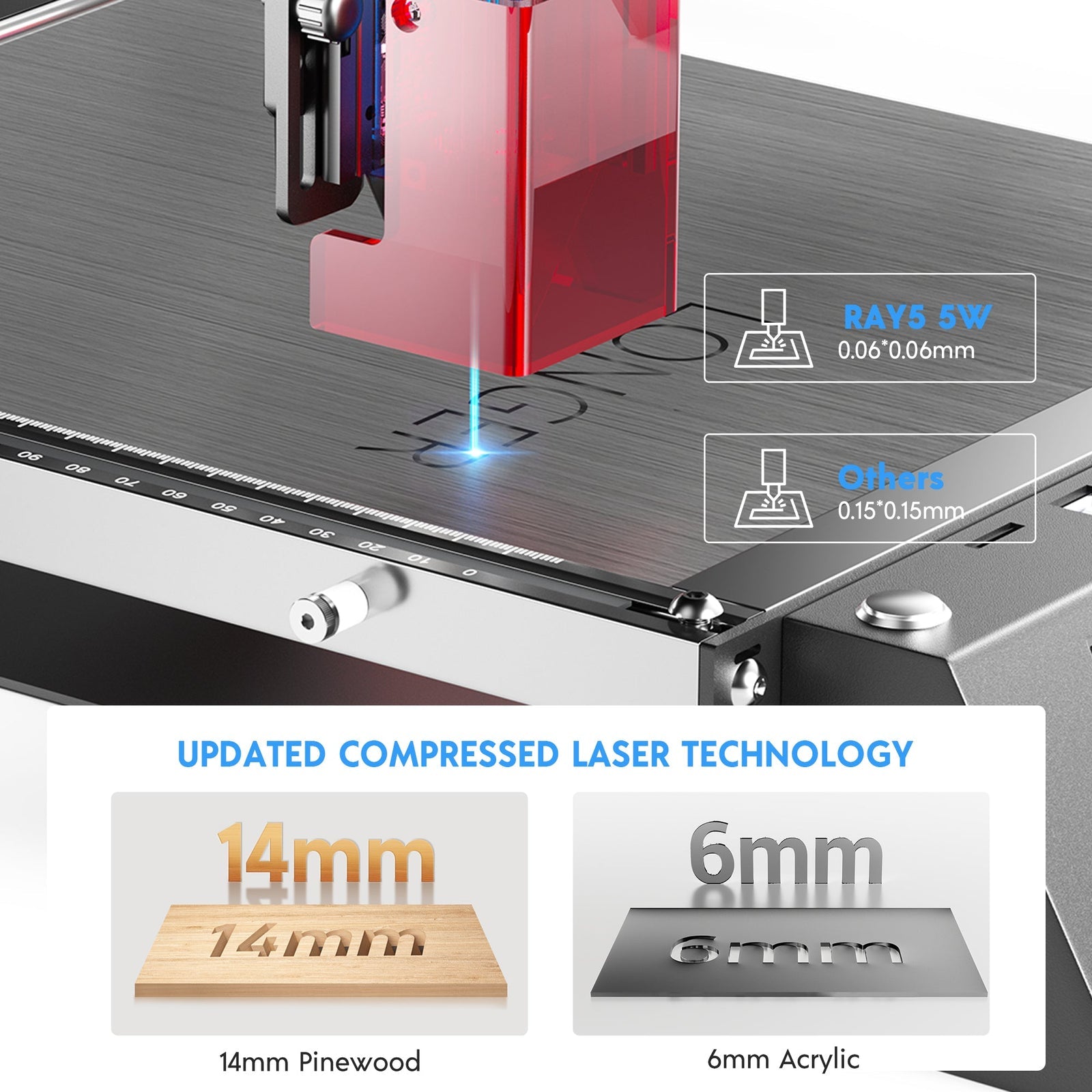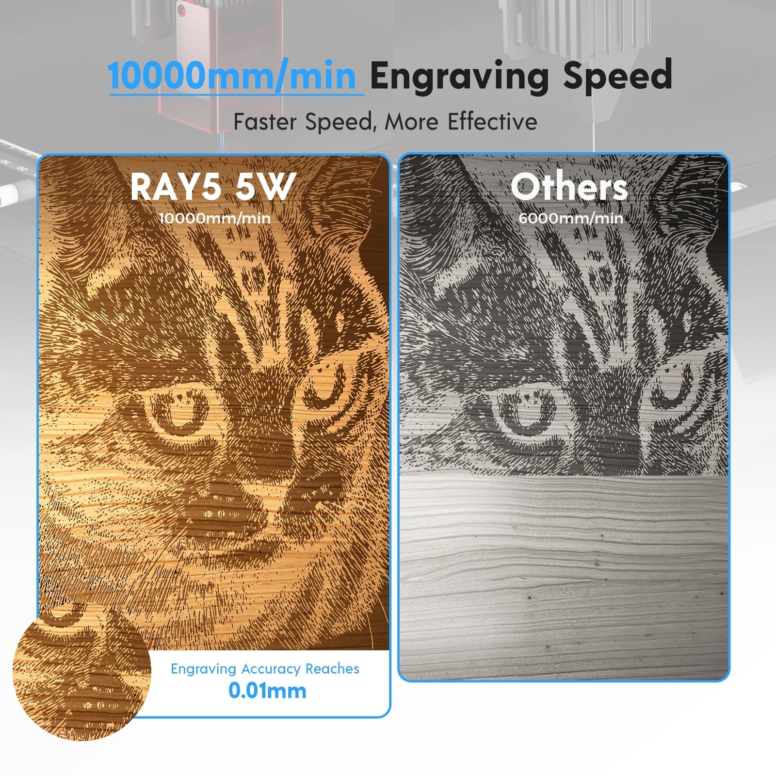 Ray5 5W laser engraver has a strong 5.5W output power and adopts the latest laser FAC compressed technology, the laser spot size is 0.08*0.08mm, which makes engraving or cutting more strong and precise. The engraving speed can reach up to 10000 mm/min